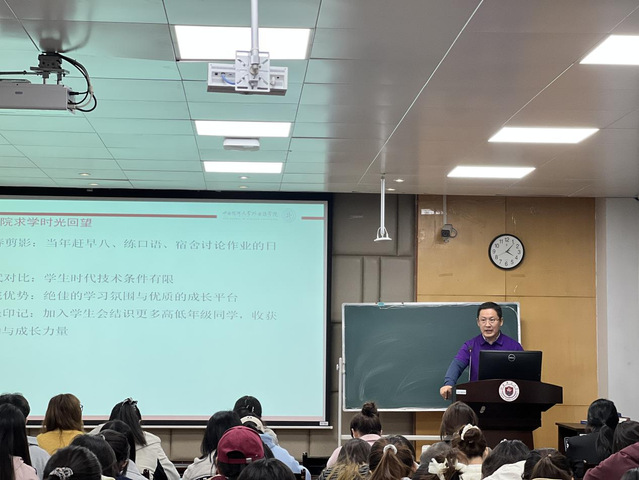 戴老师以“二十载光阴流转,初心不改母校情”为主题展开分享。他深情回顾了20年前在外院的求学时光,从课堂上的专业深耕到社团活动中的能力锻炼,从图书馆的挑灯夜读到与同窗的青春记忆,生动再现了一代师大学子“勤学笃行”的精神风貌。