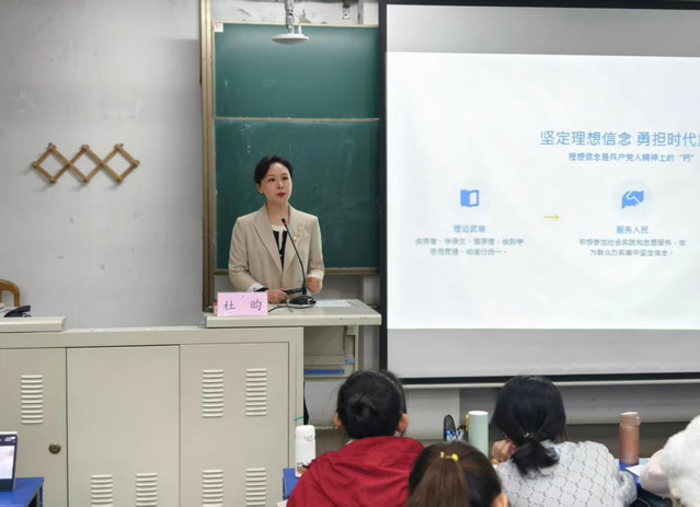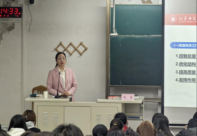 吴晨书记以《中国共产党发展党员工作细则》(以下简称《细则》)为切入点,从发展党员工作的总要求、基本原则、目标等方面对《细则》做了详细解读,明确了新形势下发展党员的新要求。吴书记从申请入党、确定入党积极分子、发展对象、接收预备党员及预备党员转正五个阶段、二十五个步骤讲解发展党员的基本流程及材料的规范要求。她强调,发展党员必须始终把政治标准放在首位,严格遵循“控制总量、优化结构、提高质量、发挥作用”的总要求,坚决杜绝“简化程序、降低标准、突击发展”等问题。作为入党积极分子,需不断强化理论学习,积极投身实践,主动接受组织培养,严守纪律,锤炼党性,在思想上和行动上同步向党组织靠拢,争取早日成为“思想上入党、行动上合格”的共产党员。