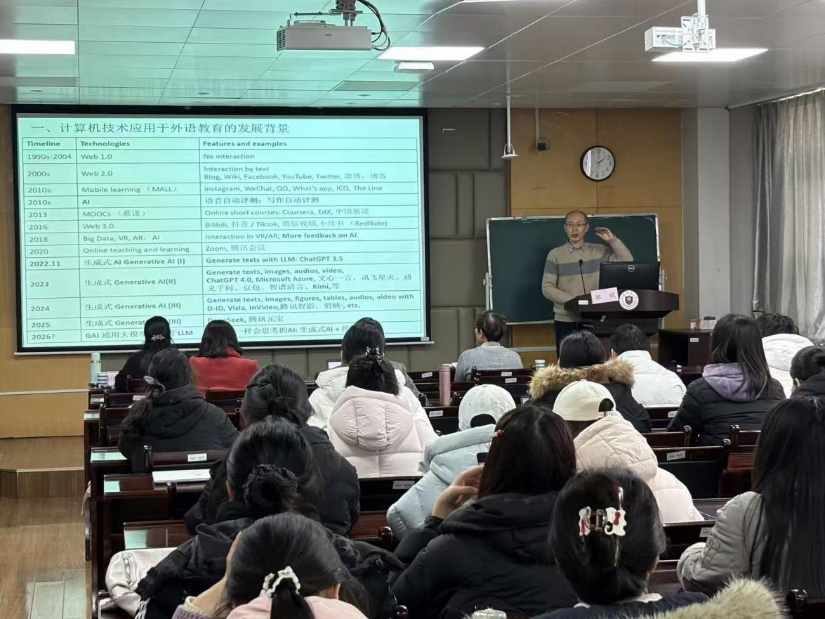 2025年12月26日,我院成功举办“生成式AI赋能英语教学与研究”专题学术讲座,特邀西交利物浦大学应用语言学系对外英语教育硕士专业主任邹斌教授担任主讲嘉宾。讲座由副院长张乐金主持,外国语学院部分教师及研究生到场聆听,并与专家进行了深入交流。